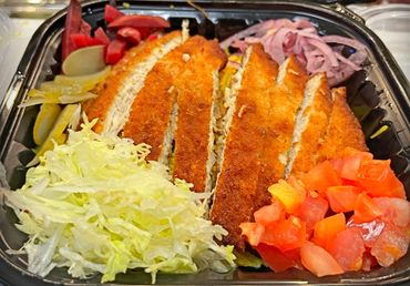 MARINATED BONELESS CHICKEN BREAST WITH FRESH HERBS AND SEASONED BREAD CRUMBS THEN DEEP FRIED TO A PERFECT CRISP SERVED OVER BED OF YELLOW SAFFRON BASMATI RICE WITH A VARIETY OF MIDDLE EASTERN PICKLES, LETTUCE, TOMATO, HUMMUS AND RED ONIONS WITH OUR HOMEMADE AIOLI DRESSING AND HOT PITA BREAD.