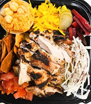 OVER BED OF YELLOW SAFFRON BASMATI RICE WITH A VARITY OF MIDDLE EASTERN PICKLES, LETTUCE, TOMATO, HUMMUS, GRAPE LEAVES, SAUTEED PEPPERS AND ONIONS AND RED ONIONS WITH OUR HOMEMADE AIOLI DRESSING AND HOT PITA BREAD.