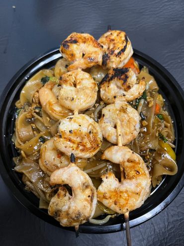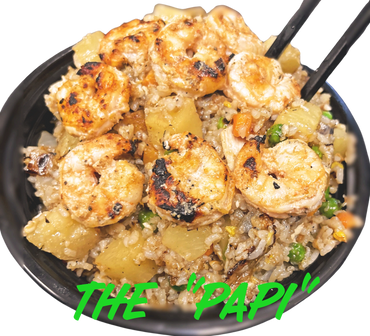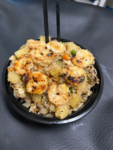 TENDER STEAK SHAWARMA & JUMBO FRIED SHRIMP SERVED OVER BED OF YELLOW SAFFRON BASMATI RICE WITH A VARIETY OF MIDDLE EASTERN PICKLES, LETTUCE, TOMATO, HUMMUS AND RED ONIONS WITH OUR HOMEMADE AIOLI DRESSING AND HOT PITA BREAD.
